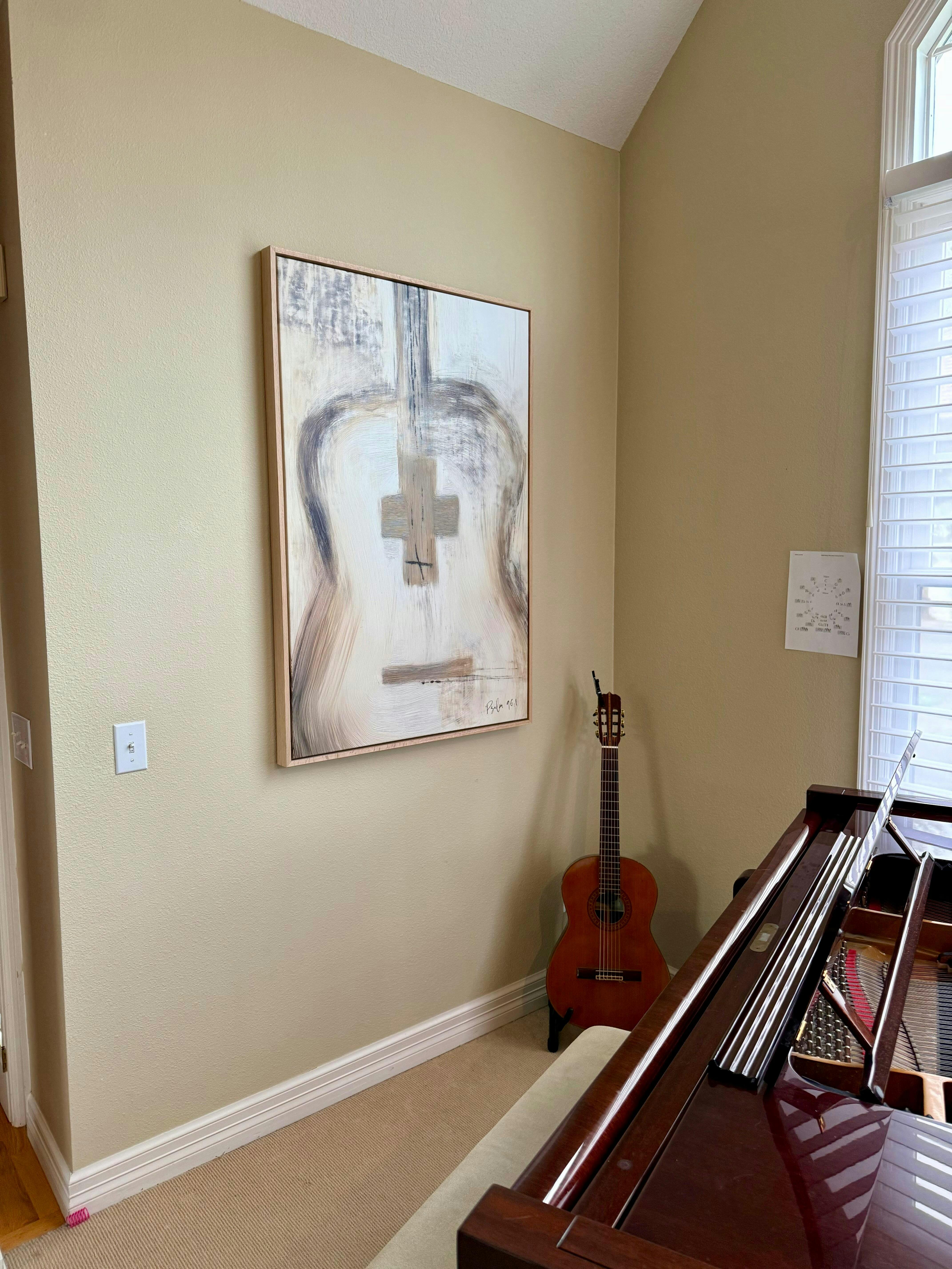 This piece reflects the calling to worship—not just in voice, but with our whole lives. The guitar silhouette reminds us that music is a gift, and when it's offered back to God, it becomes an act of praise. The cross at the center represents Christ at the heart of our worship. Whether you’re a musician or simply someone whose soul stirs at the sound of a worship song or hymn, may this serve as a visual reminder to make melody to the Lord with gratitude in your heart.