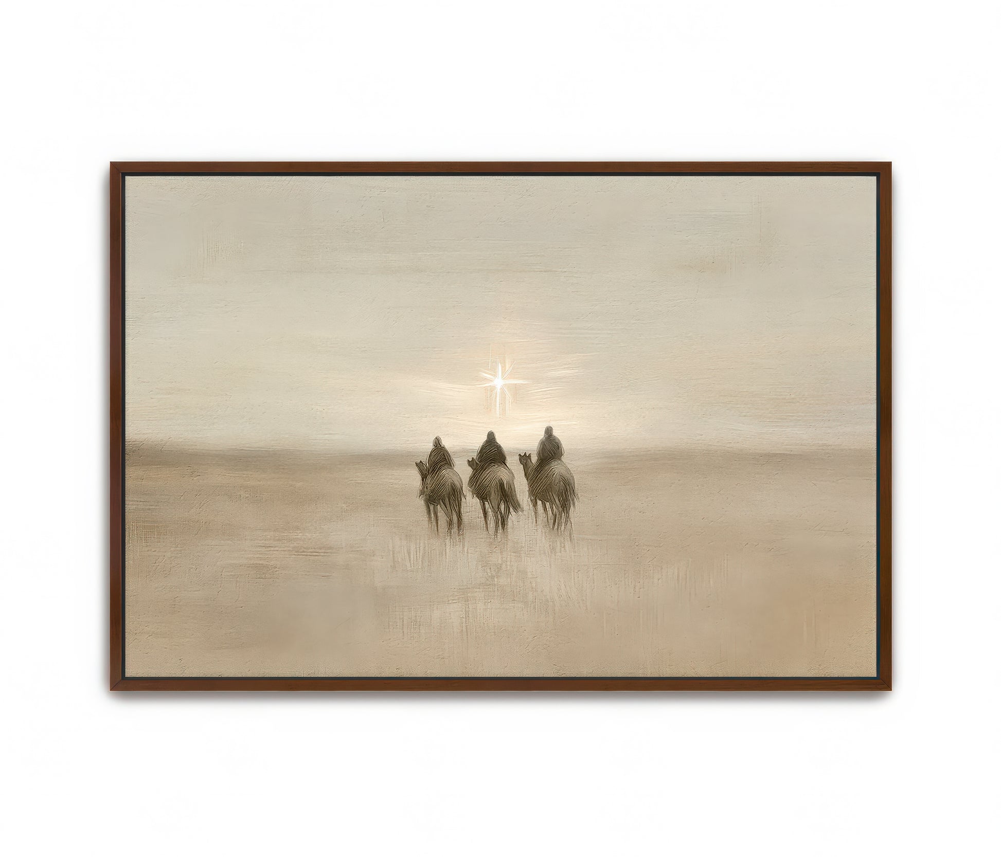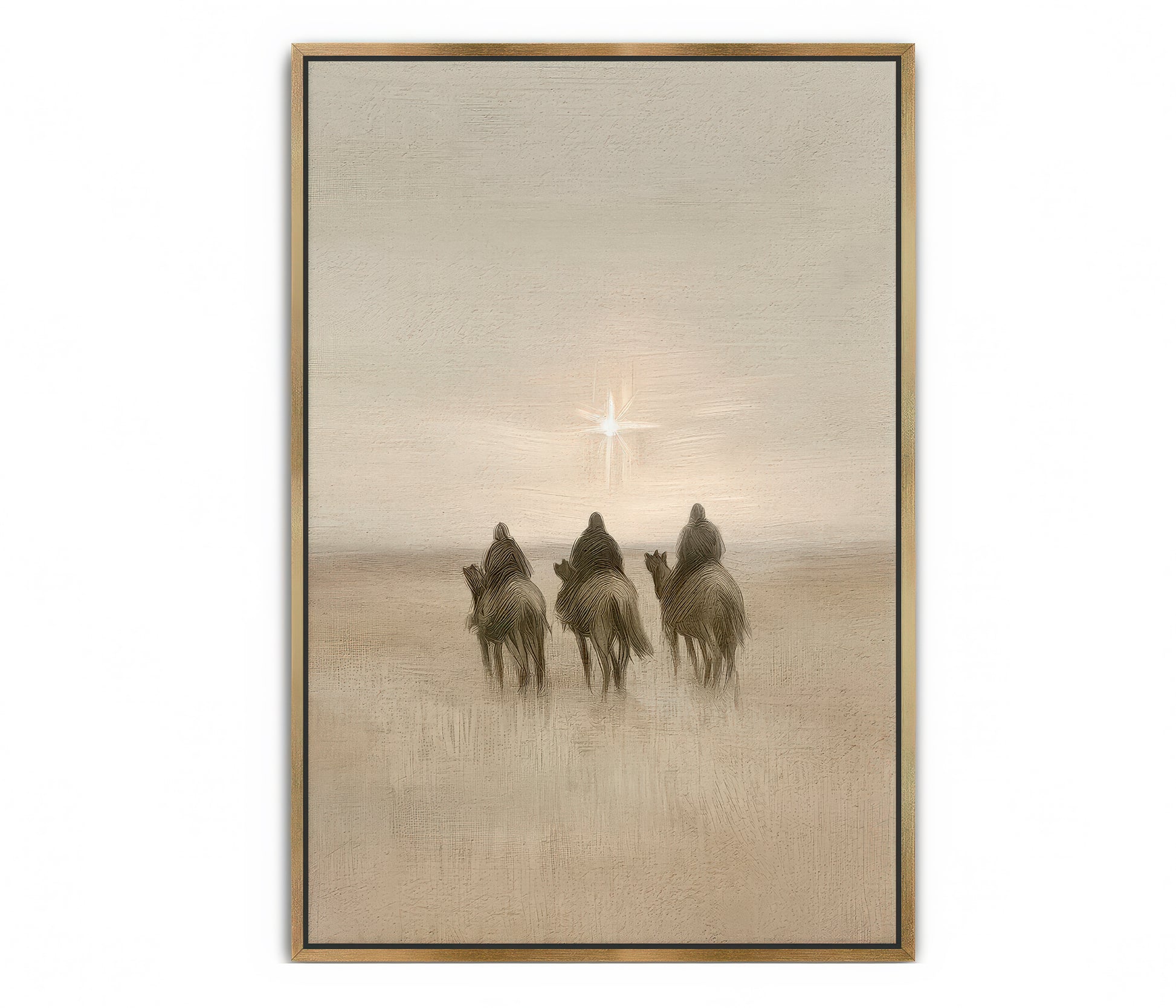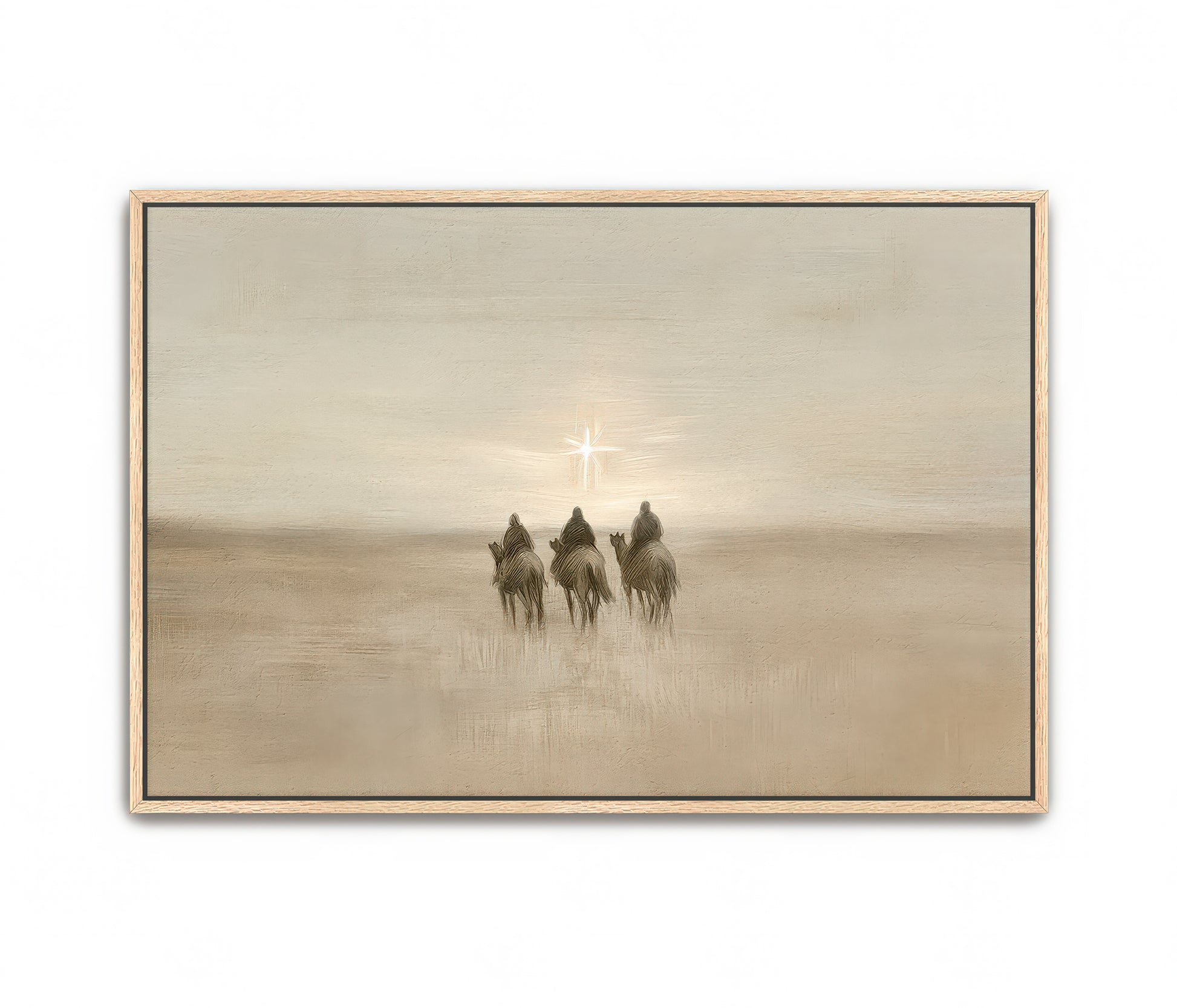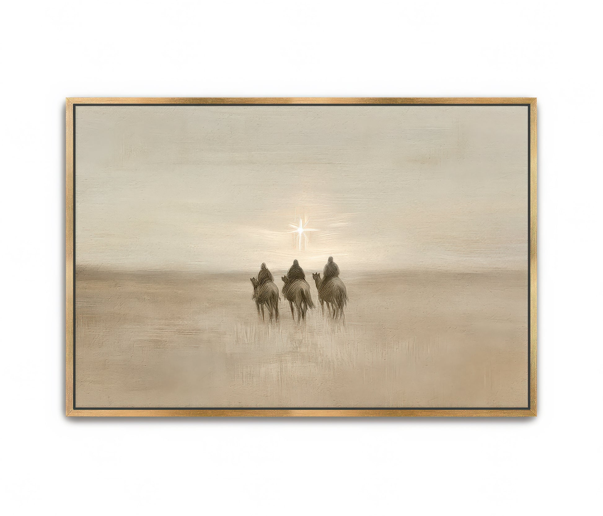"Three Wise Men" captures the quiet reverence of the Magi as they journey across vast deserts, guided by the light of the star to worship the newborn King. Their journey reminds us of the humility and devotion required to seek Jesus, no matter how far we must go. In the stillness of the desert, they followed the star, a symbol of hope and divine promise fulfilled. This piece invites you to reflect on your own journey to seek Him, inspired by the wise men’s unwavering faith.