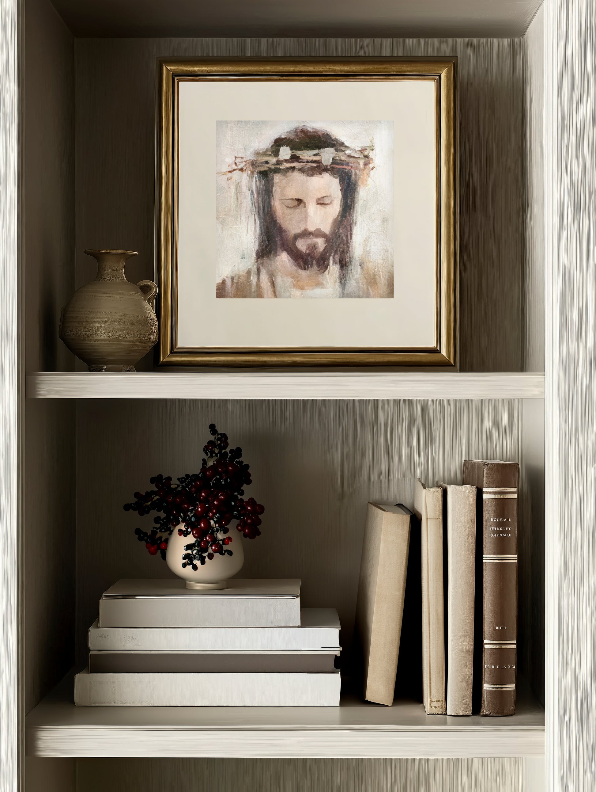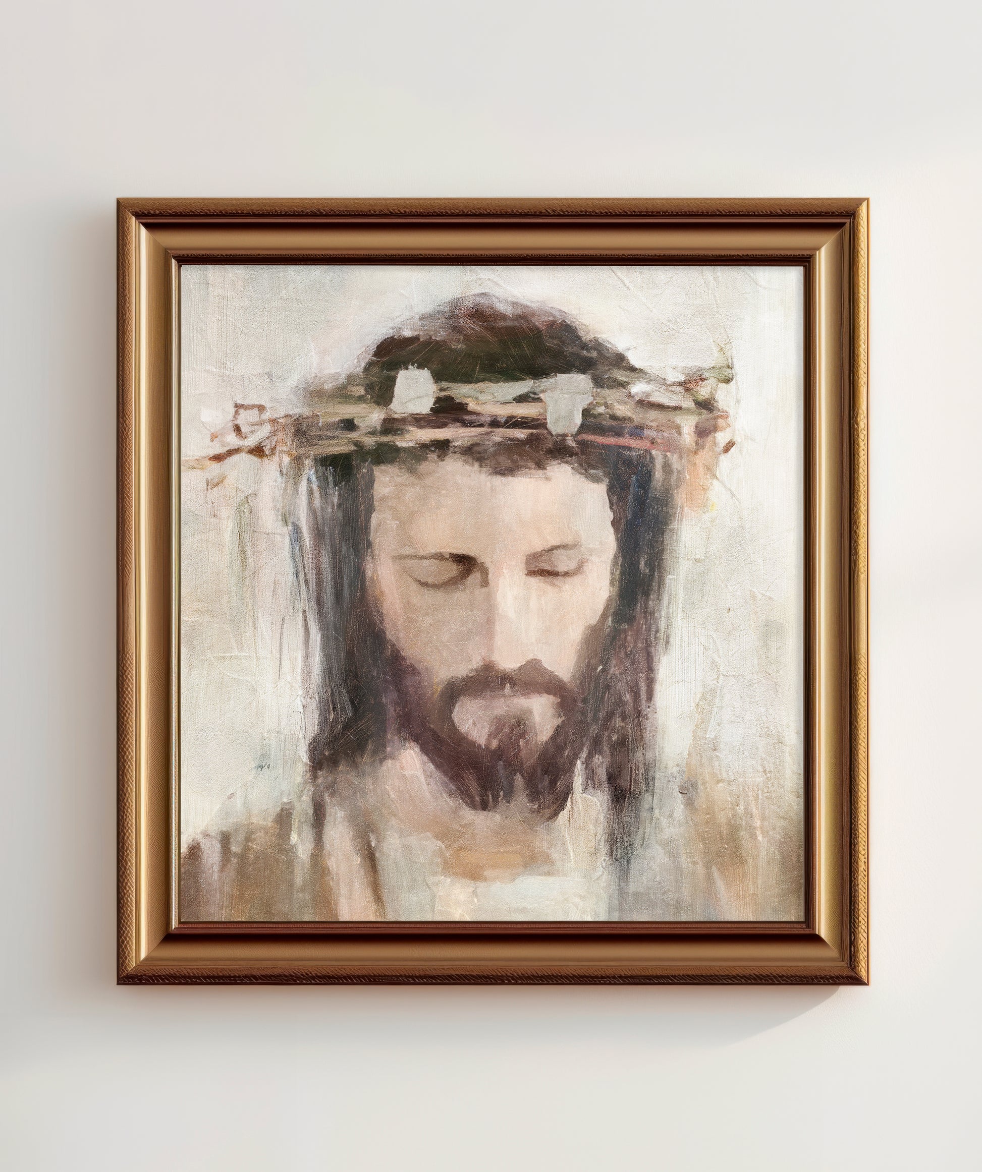 This artwork captures a profound moment of reflection as Jesus, the King of Kings, wears the crown of thorns. The imagery serves as a powerful reminder of His willing sacrifice and the depth of His love for humanity. Despite His divine nature and rightful authority, Jesus humbled Himself, taking on the suffering that was meant for us. The crown of thorns, a symbol of mockery and pain, is transformed into a crown of glory through His obedience to the Father's will.