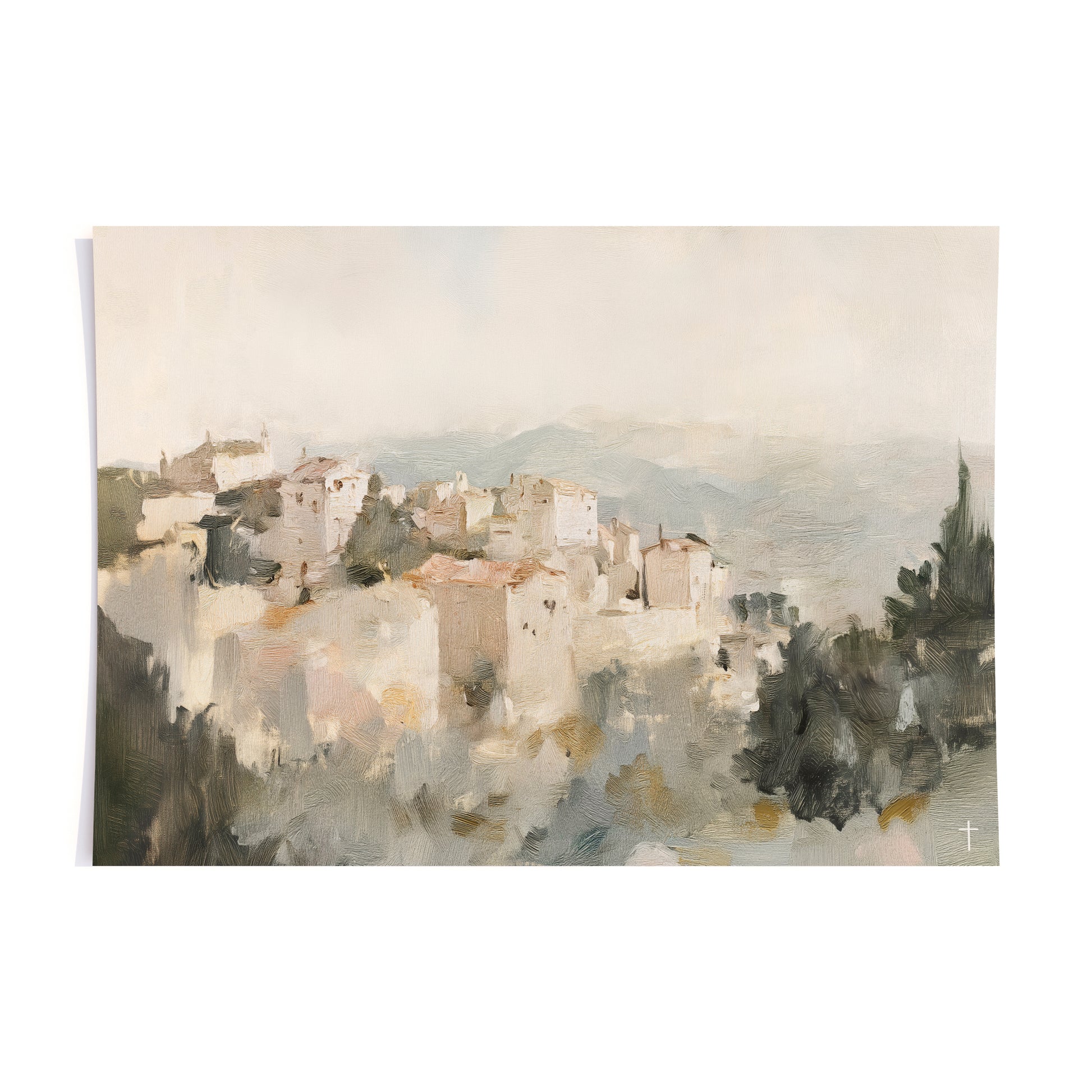 This artwork portrays the cityscape of Nazareth, a significant place in the life of Jesus, where He grew up according to Matthew 2:23. It symbolizes Jesus' humble beginnings and His identification with humanity, living among ordinary people in a small town. Nazareth represents Jesus' humanity and His willingness to embrace the human experience fully.