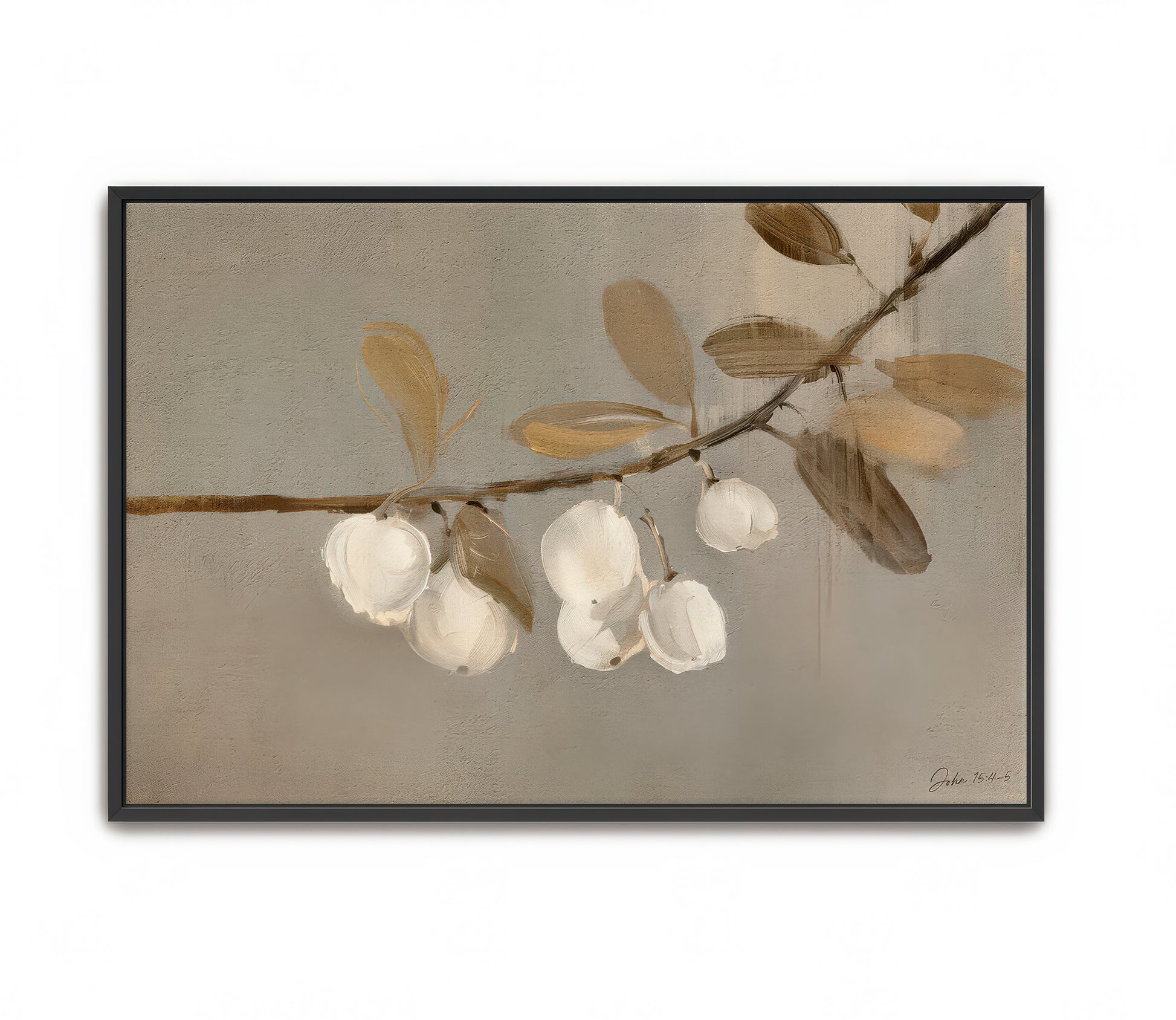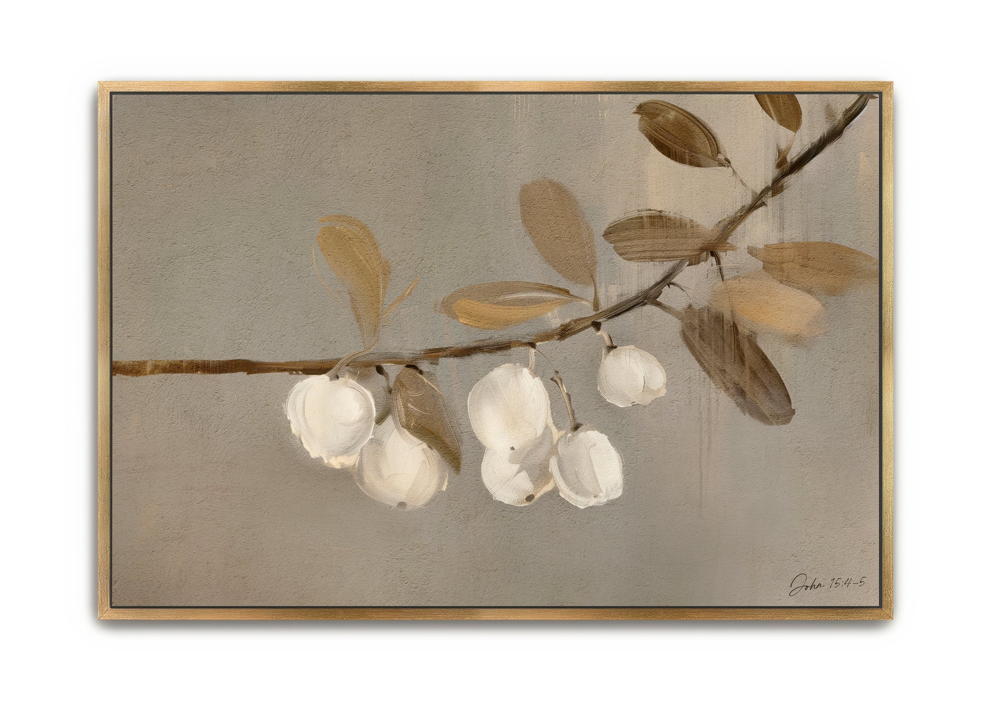 In these verses, Jesus speaks about the vital connection between the vine and the branches. The delicate white fruit depicted on the branch symbolizes the spiritual fruit that can only be born when we remain deeply connected to Christ, much like a branch must remain connected to the vine to bear fruit.